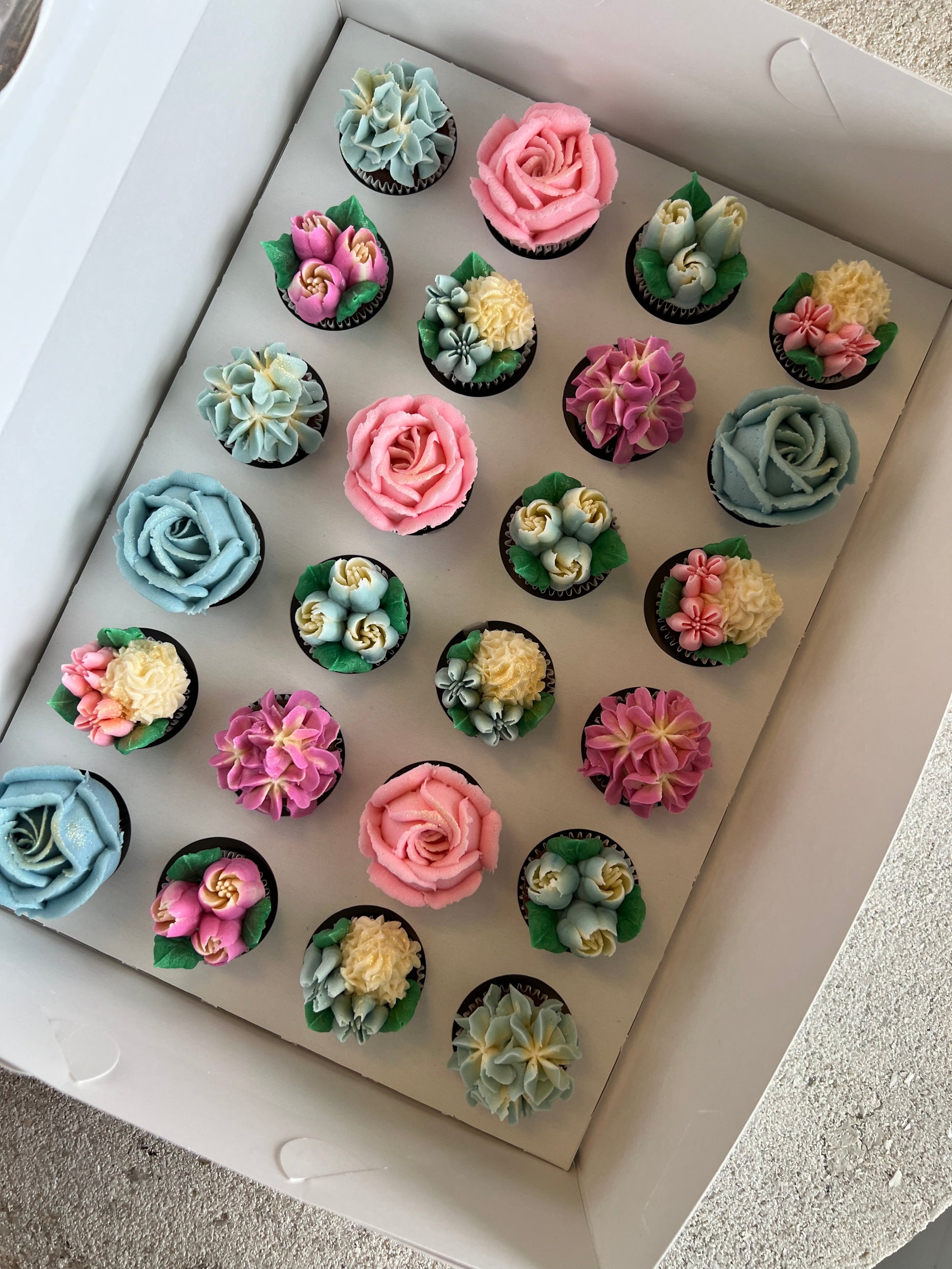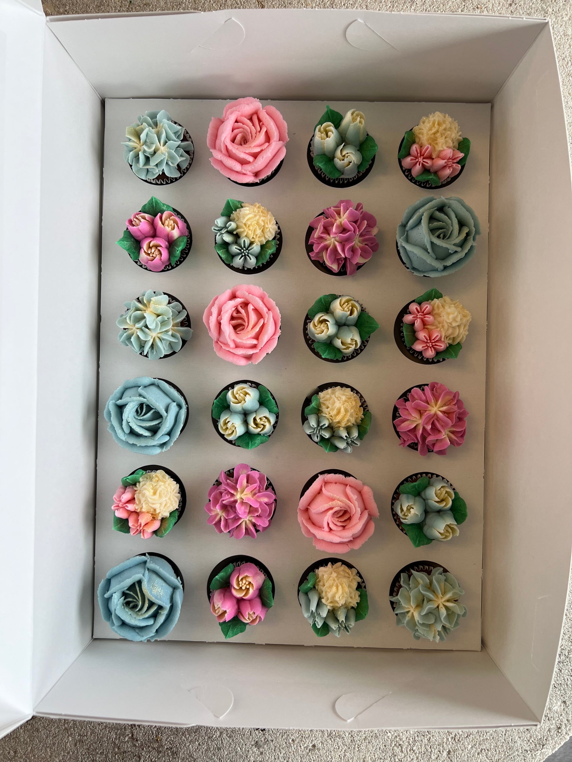 Our classic mini 24 box of cupcakes comes with 24 beautiful edible florals in a white box. Mini's are bite-sized. Bite-sized cupcakes are great for events and gatherings that have a lot of dessert or for individuals that like small amounts of dessert at a time.
